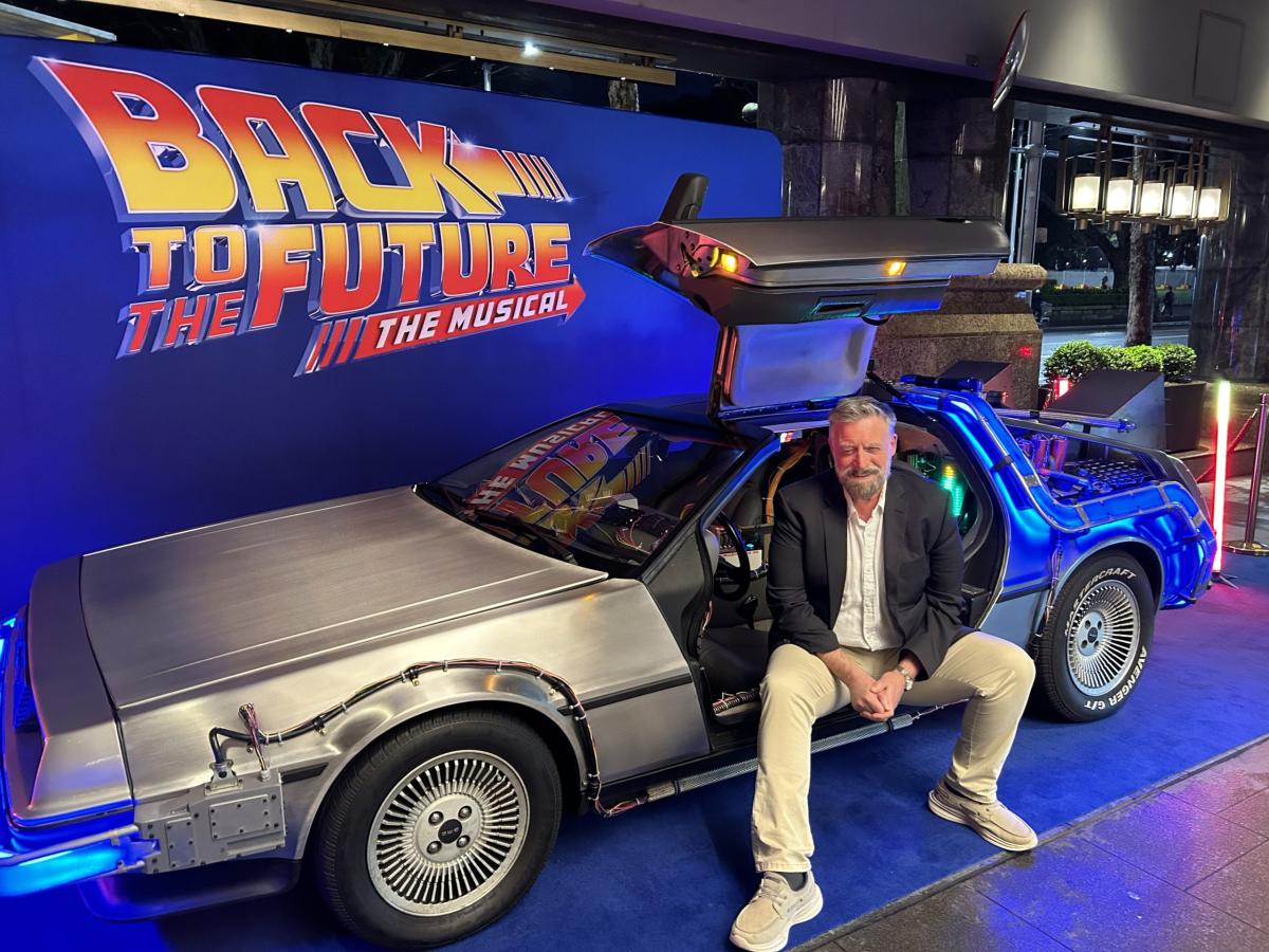 In the DeLorean, getting ready to travel back in time at the Back To The Future: The Musical launch, Sydney